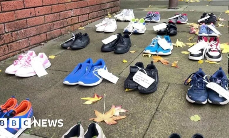 The shoes – laid at council offices across England – have photos and notes of personal stories attached.